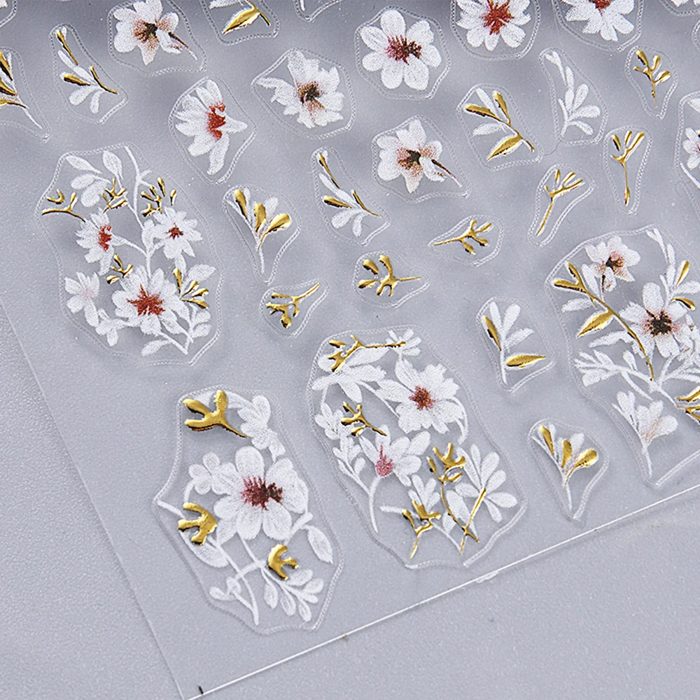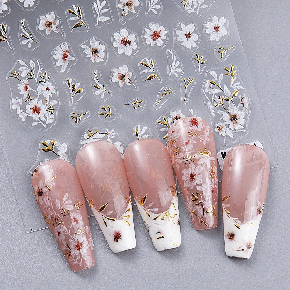 1-2pcs Gold Line Cherry Blossom 3D Nail Art Stickers Spring Peach Flowers Daisy Flowers Gold Leaves Nail Decals For DIY Manicure