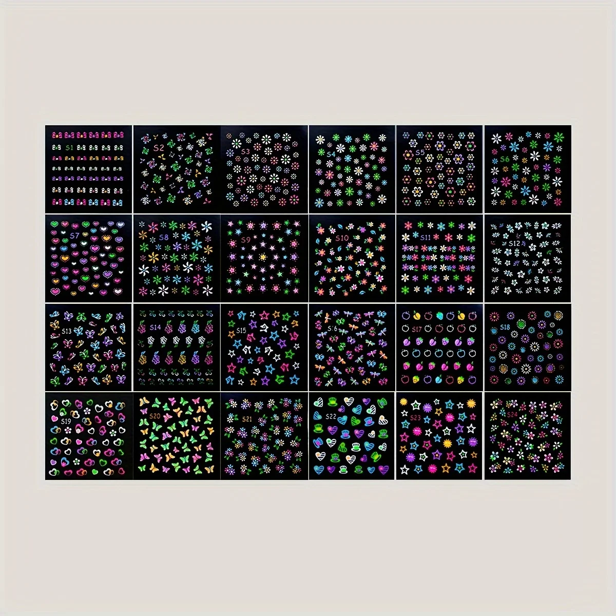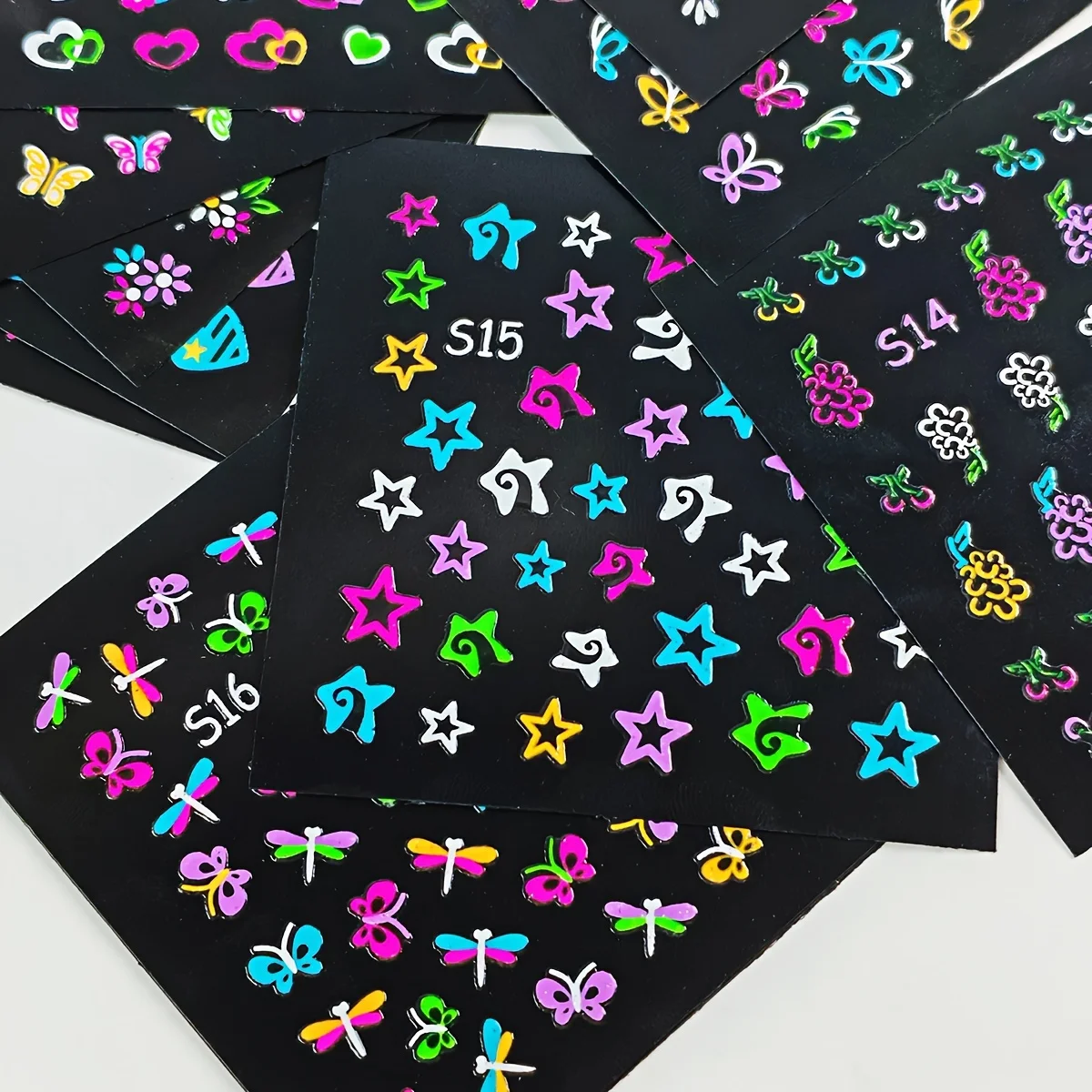 30 Sheets 3D Glow in The Dark Neon Nail Stickers - Glittery Glossy Self-Adhesive Nail Art Decorations with Butterfly, Love Heart