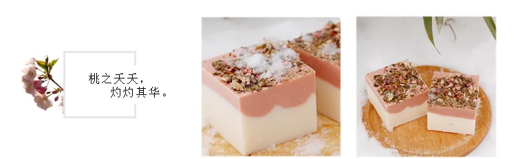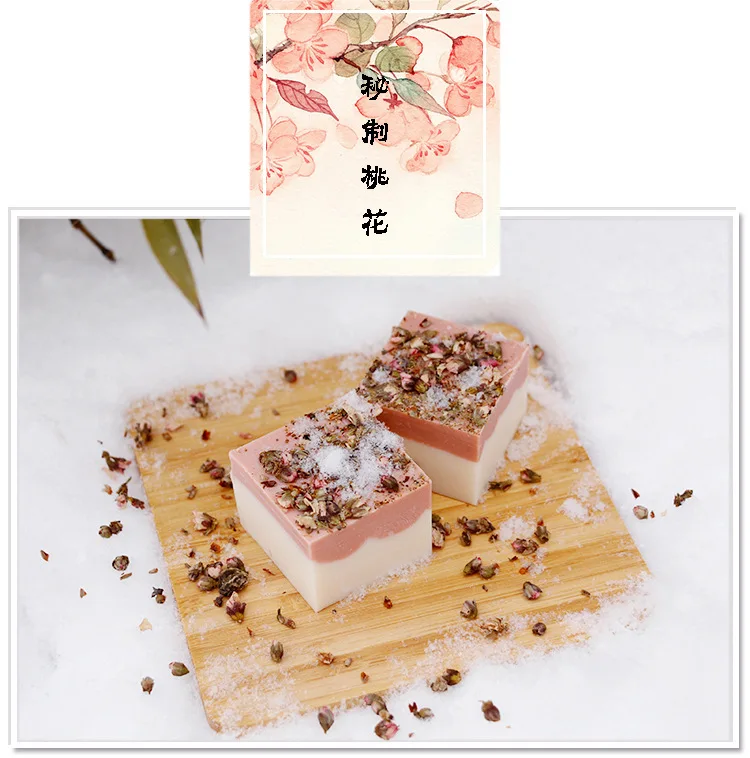 Ingredients: peach blossom soaked olive oil, coconut oil, sweet almond oil, shea butter, Australian walnut oil, essential oil of white orchid leaf, peach blossom puree, peach petals, sea water alkali
