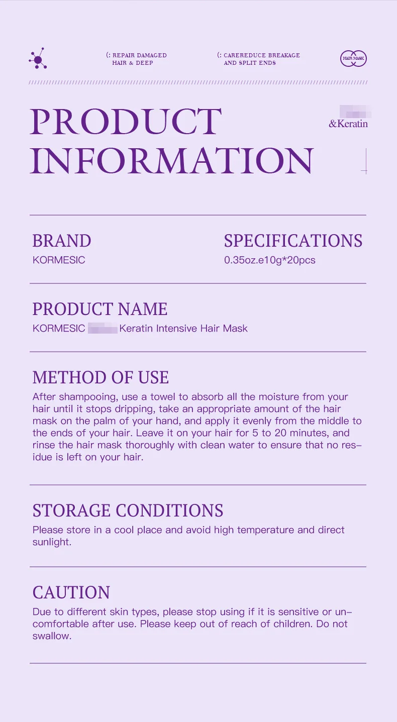 ●This Based on the studv of more than hair situation of 10,000consumers, develop this care products with high technology--- importedraw materials combined with fine molecular technology, 5 seconds to make your hair smooth and soft.